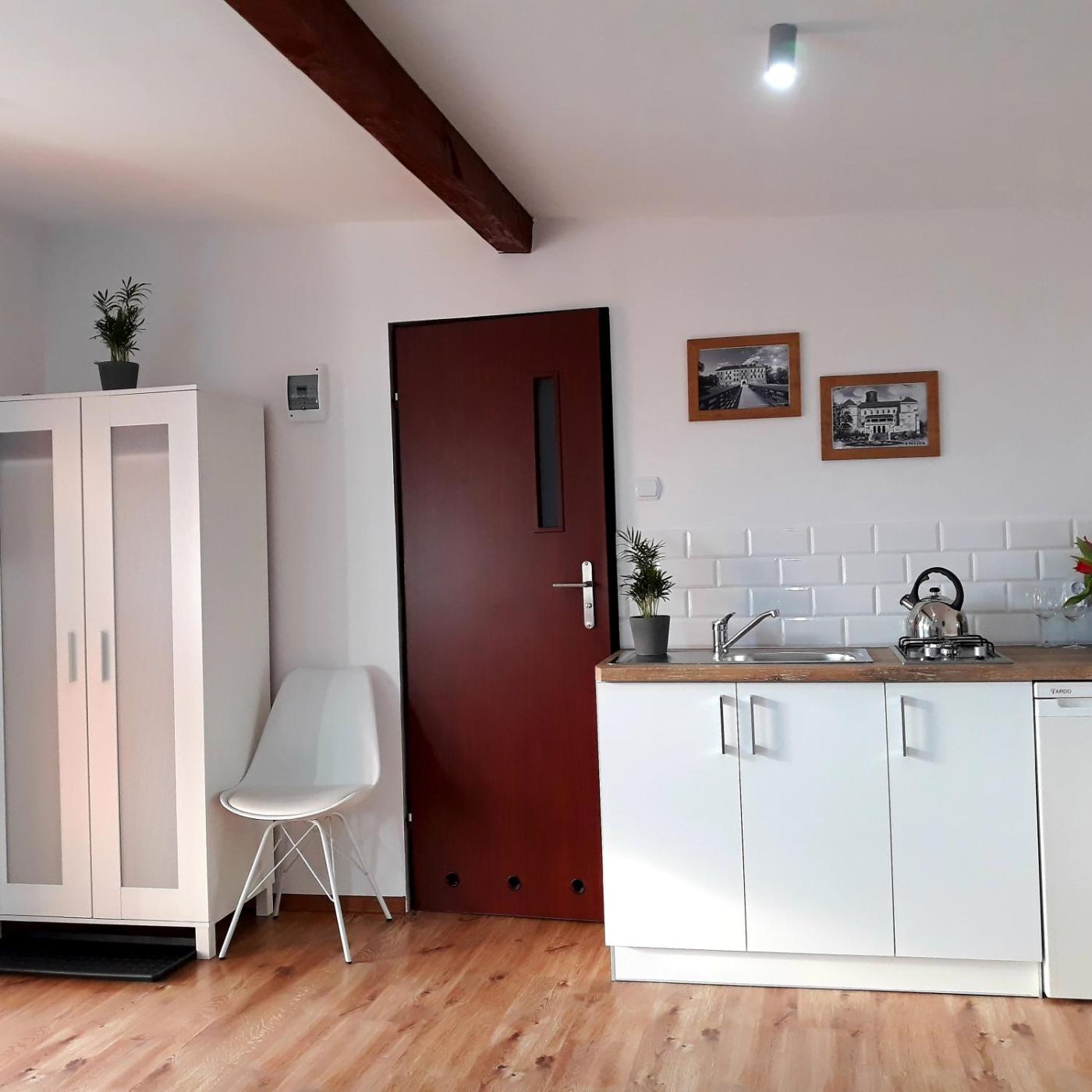 Domek. Boasting a private entrance, this chalet comes with 1 living room, 1 separate bedroom and 1 bathroom with a walk-in shower. The kitchen features a stovetop, a refrigerator and kitchenware. The chalet features a tea and coffee maker, a dining area, a wardrobe, a flat-screen TV with cable channels, as well as garden views. The unit has 2 beds. Domek - 2 osobowy. Powierzchnia pokoju ok.: 35 mkw. ;